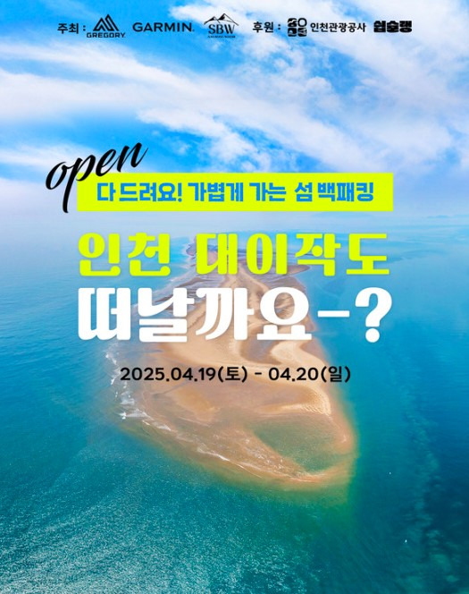 이번 프로젝트에는 MZ세대의 트렌드를 잘 이해하는 다양한 브랜드들이 함께합니다. 감각적인 디자인과 뛰어난 기능성을 자랑하는 아웃도어 브랜드 ‘그레고리’와 스마트한 아웃도어 활동을 위한 필수템 ‘가민’, 그리고 맛과 편리함을 모두 갖춘 캠핑푸드 브랜드 ‘쉽슐랭’은 행사 참가자들에게 특별한 용품과 맛있는 식사를 지원하여 더욱 풍성하고 즐거운 백패킹 경험을 선사할 예정입니다. 또한, 여행 전문 기업 SBW여행사와의 협력을 통해 인플루언서 및 참가자들이 촬영한 아름다운 사진과 영상을 SNS를 통해 실시간으로 공유하며, 대이작도의 매력을 더욱 널리 알릴 계획입니다.