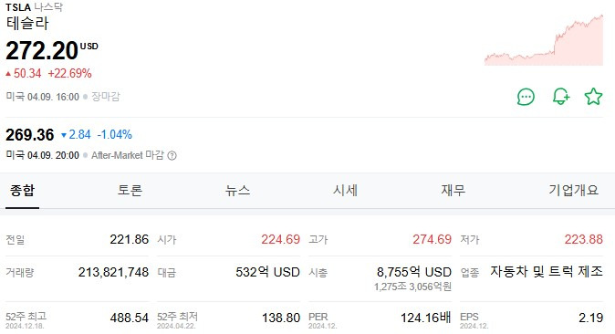 지난 2일, 트럼프 대통령의 상호관세 발표는 뉴욕 증시에 찬물을 끼얹었고, 혁신의 아이콘 테슬라 역시 매서운 하락세를 피할 수 없었습니다. 4거래일 동안 무려 21.5%나 급락하며 투자자들의 불안감을 증폭시켰습니다. 하지만 9일(현지시각), 드라마틱한 반전이 일어났습니다. 무려 50.34달러, 22.69%라는 경이로운 상승률을 기록하며 272.20달러로 장을 마감한 것입니다. 이는 며칠간의 깊은 골짜기를 순식간에 메우는 압도적인 상승세였습니다.