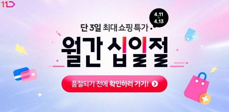 11번가의 4월 '월간 십일절'은 단순한 쇼핑 행사를 넘어, 다가오는 여름을 설레는 마음으로 준비하고 일상에 활력을 불어넣는 특별한 기회입니다. 풍성한 할인 혜택과 다채로운 이벤트를 통해 여러분의 쇼핑 경험을 더욱 풍요롭게 만들어보세요. 지금 바로 11번가에 접속하여 시원한 여름맞이 쇼핑을 시작해보세요!