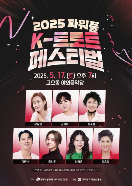 별빛 쏟아지는 대구 밤, 트로트 선율에 마음을 맡기다… 2025 파워풀 K-트로트 페스티벌 초대! 2025년 5월, 푸르른 밤하늘 아래 대구의 심장이 뜨겁게 고동칩니다. 지친 일상에 위로와 활력을 불어넣어 줄 감동의 선율, 바로 '2025 파워풀 K-트로트 페스티벌'이 5월 17일 저녁 7시, 아름다운 자연을 품은 코오롱 야외음악당에서 여러분을 기다립니다. 대한민국을 대표하는 별들이 총출동하여, 잊지 못할 감성의 밤을 선사할 예정입니다.