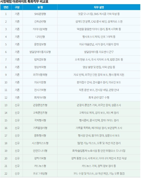 - 다양한 직무 분야, 나의 재능을 발휘할 기회 : 이번 여름에는 특히 '특화 직무' 분야가 22개로 대폭 확대되었습니다. 지난 참가자들의 의견을 적극 반영한 결과인데요, 이제 여러분의 특별한 재능과 역량을 시정 발전에 기여하며 마음껏 펼칠 수 있습니다. 자신의 강점을 살려 의미 있는 경험을 하고 싶은 청년이라면 특화 직무에 도전해보세요!