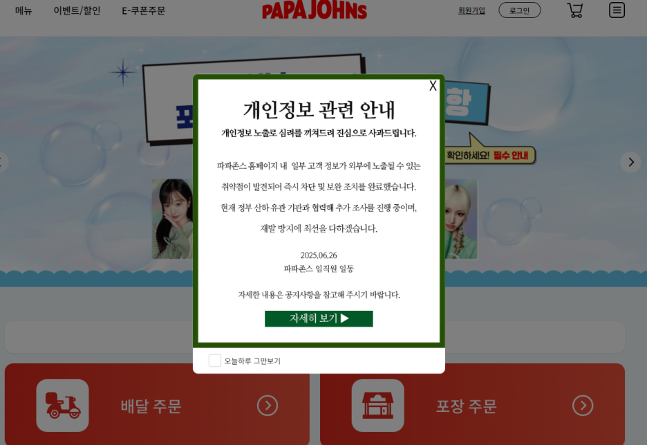 - 해당 서비스 탈퇴 및 비밀번호 변경 : 이번 사고의 경우 파파존스 회원이라면 즉시 비밀번호를 변경하고, 해당 사이트에 저장된 결제 정보를 삭제하는 것이 중요합니다.