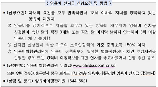 양육비 선지급 제도 안내 ‘양육비 선지급’이란, 양육비 정기지급 채권이 있음에도 양육비를 지급받지 못하는 기준 중위소득 150% 이하 한부모가족 자녀에게 국가가 양육비를 우선 지급하고,