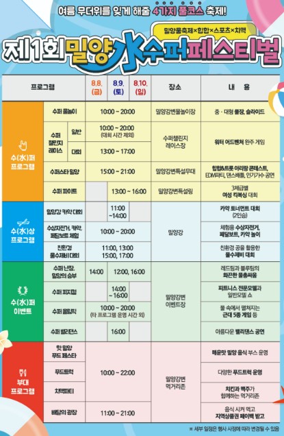 2025년 8월, 당신의 여름 버킷리스트에 '2025 밀양 수(水)퍼 페스티벌'을 추가하세요. 지금 바로 가족, 친구, 연인과 함께 밀양에서 잊지 못할 추억을 만들어갈 계획을 세워보는 건 어떨까요? 밀양은 여러분의 방문을 기다리고 있습니다!
