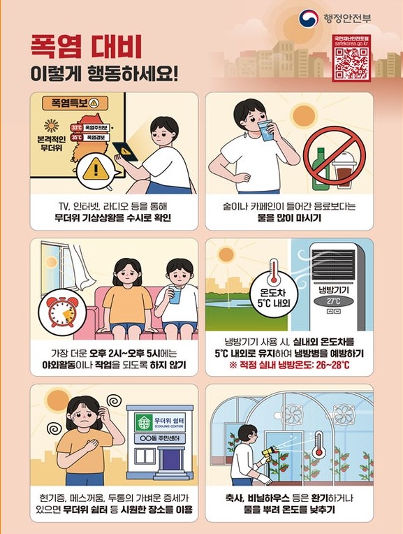 - 나만의 시원한 공간 : 집 안 온도를 적절히 유지하고, 냉방이 어렵다면 근처 무더위 쉼터나 공공시설을 적극 활용하세요.